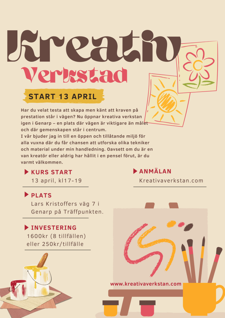 Kreativa Verkstan erbjuder en mängd aktiviteter, inklusive populära Skåla och måla-workshops där deltagarna enbart behöver ta med sig sin favoritdryck (vin/öl). Kreativa verkstan tillhandahåller alkoholfria alternativ, snacks, material och leder själva workshopen. Våra konstworkshops innefattar olika tekniker och teman. Håll ögonen öppna för att hitta en workshop som passar just dig eller er. Anmäl gärna din e-postadress för att få de senaste uppdateringarna om kommande workshops.